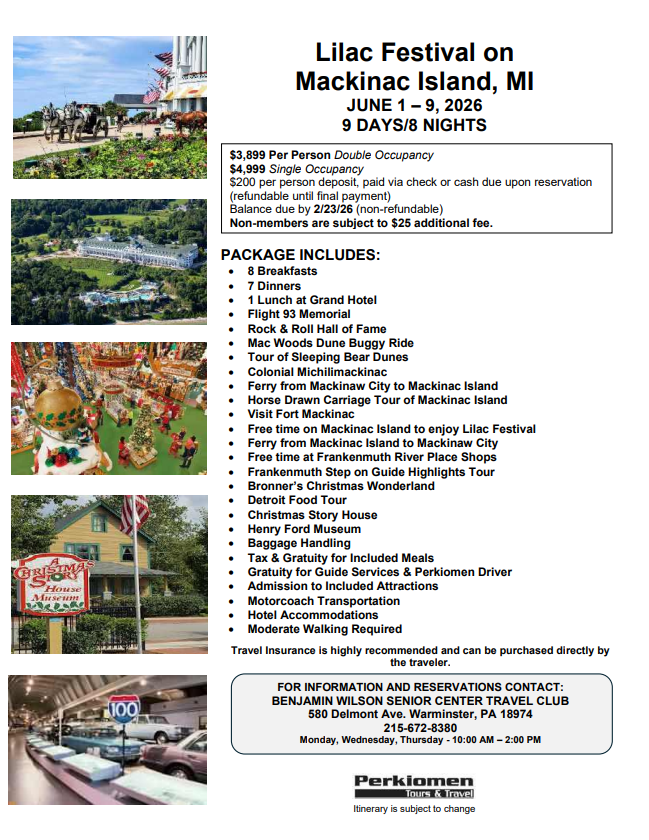 Below is a list of planned trips for our members. Scheduled trips are subject to change or cancellation. For further information, call 215-672-8380.